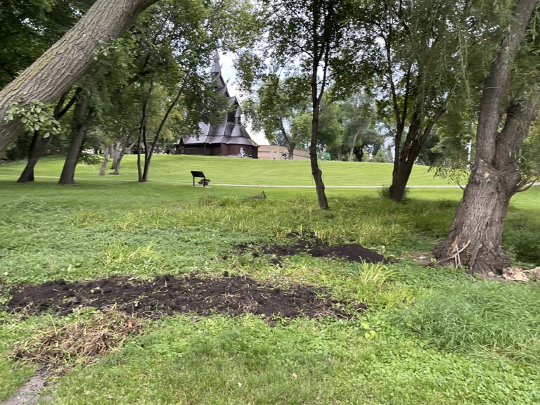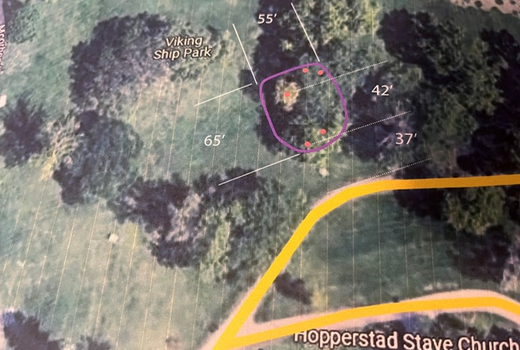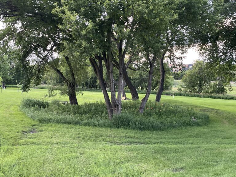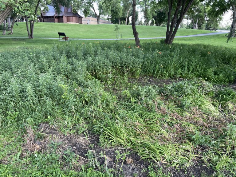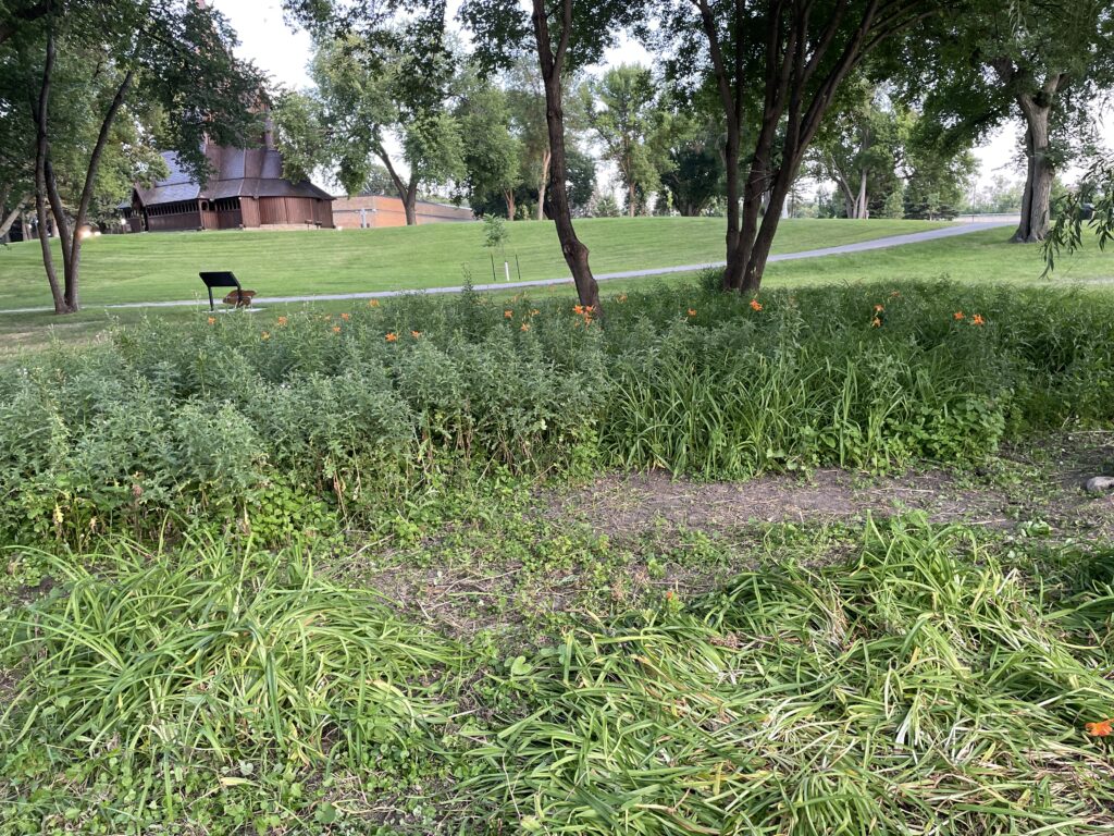 Pollinator Garden location in Viking Ship Park. The garden area is about 3500 square feet of Canada Thistle, Day Lilies, Ground cover, grasses, and trees.