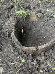 First planting area cleared and raked. Ready for planting. Uncovered multiple cement slabs in the area. Built “River of Sticks” fence line on the edge of the planting area.