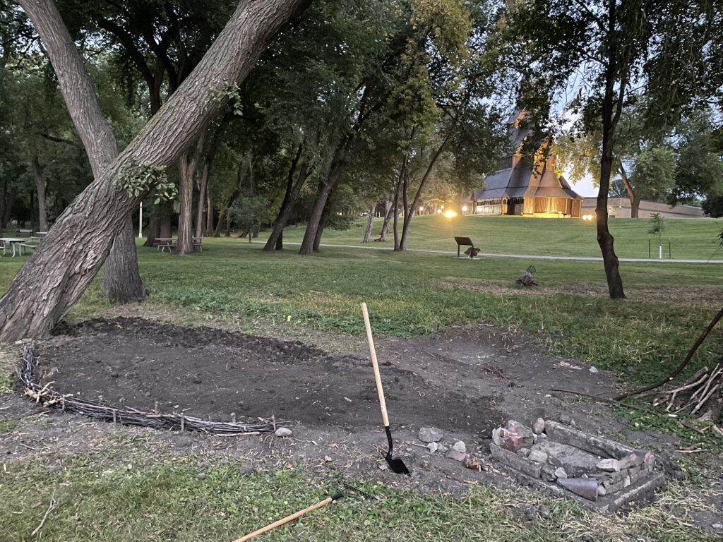 Dig up existing garden removing daylily bulbs, other plant growth, and rocks or other debris. (Moorhead Parks to help). Volunteers to pull by hand, shovel, rake and broadfork. Save rocks and concrete, removing rebar extensions, for future placement within pollinator garden as places for invertebrates